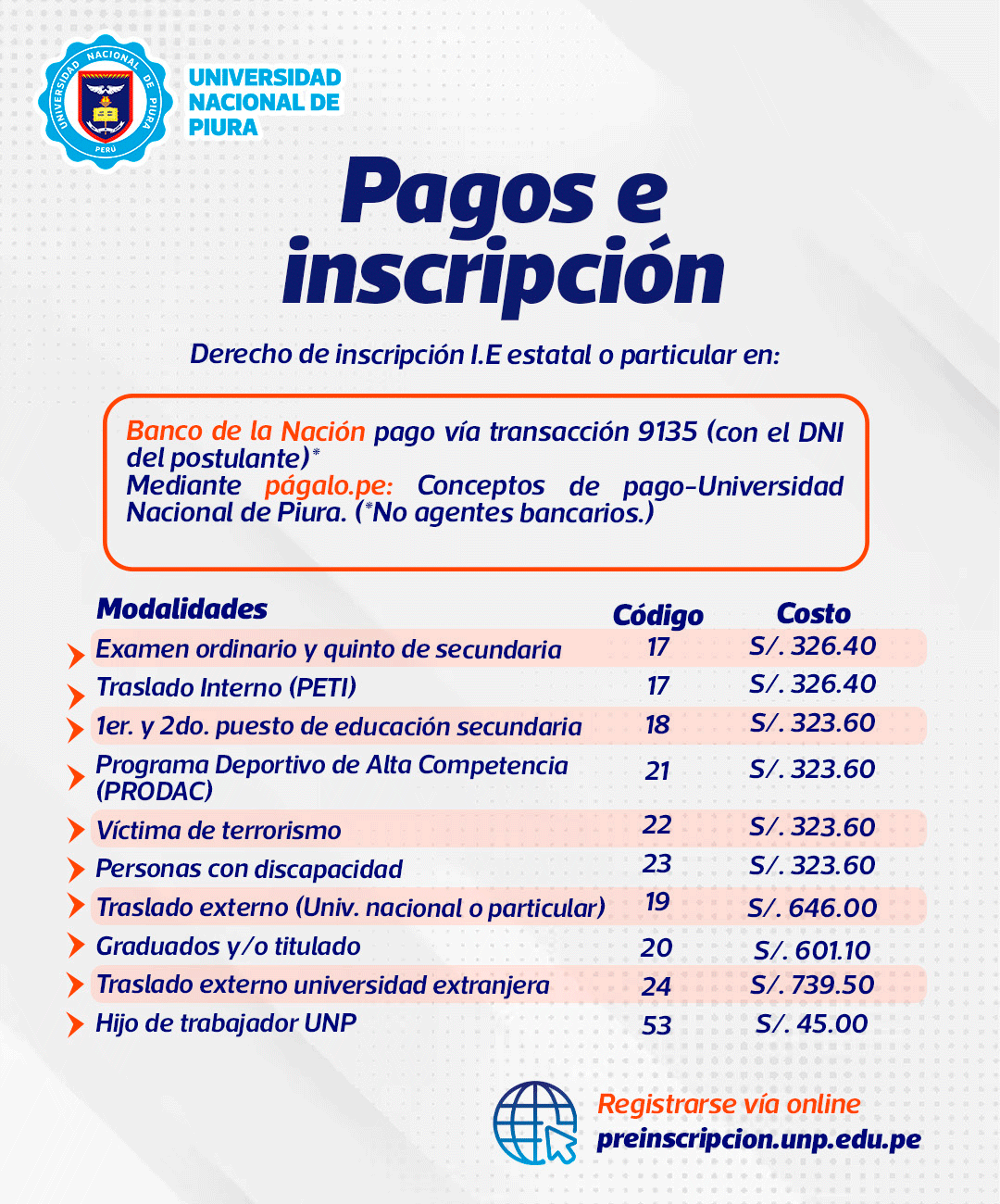 Las inscripciones para participar en el próximo proceso de admisión de la UNP son como sigue: