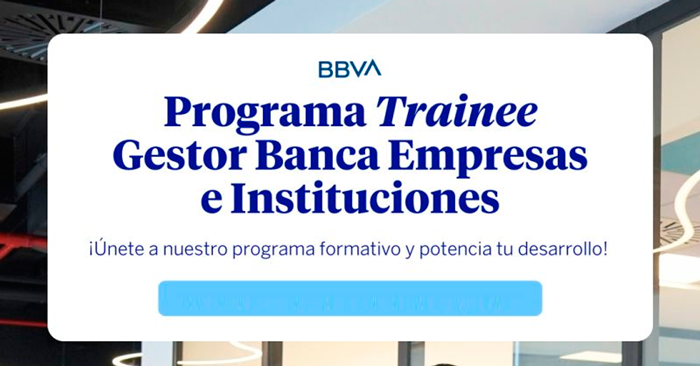 En BBVA seguimos acompañando a nuestros clientes a llegar más lejos. Por ello, te invitamos a unirte a nuestro equipo e iniciar tu carrera en nuestra banca empresa como Trainee Gestor Banca Empresas e Instituciones. Conoce más sobre la posición: