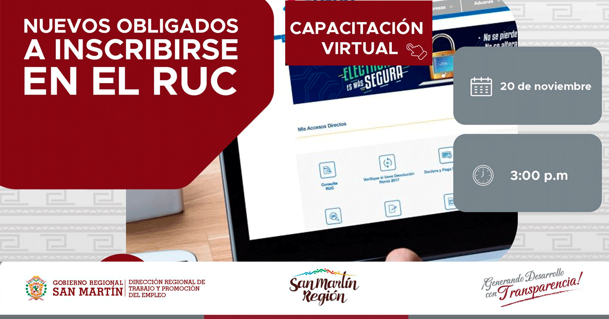 Capacitación virtual gratuita "Nuevos obligados a inscribirse en el RUC" de la DRTPE de San Martín