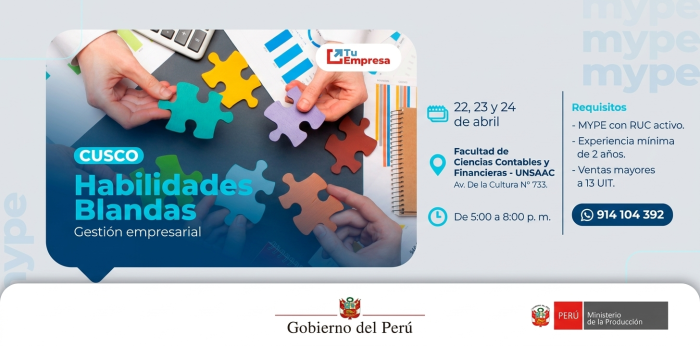 Capacitación gratuita “Habilidades Blandas”. Requisitos: MYPE con RUC activo, experiencia mínima de 2 años y ventas mayores a 13 UIT. Para informes, comunicarse al 914 104 392.