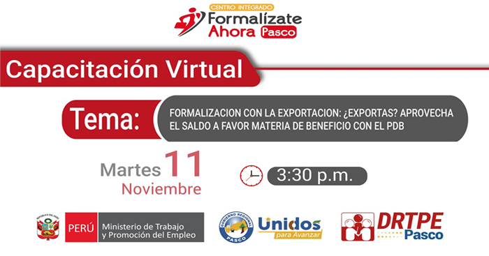 Capacitación Virtual "Formalización con la exportación: ¿Exportas? Aprovecha el saldo a favor materia de beneficio con el PDB" de la DRTPE Pasco