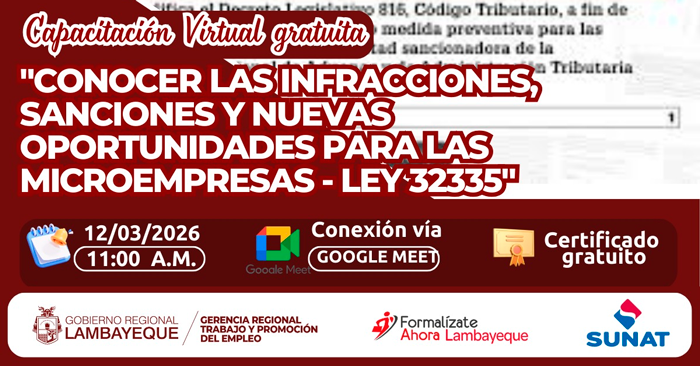 Capacitación virtual gratuita "Conocer las infracciones, sanciones y nuevas oportunidades para las microempresas – Ley 32335" de la GRTPE Lambayeque