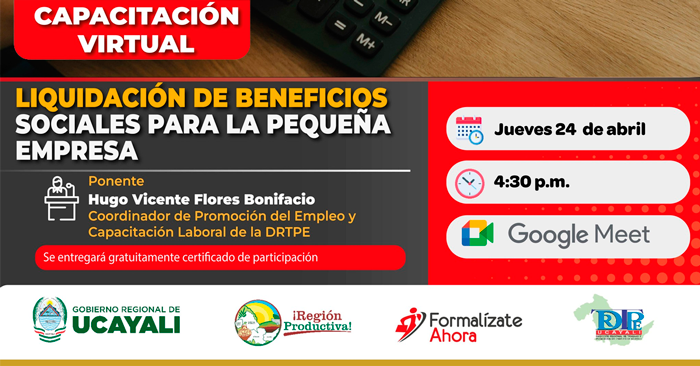 Capacitación virtual gratuita "Liquidación de Beneficios Sociales para la Pequeña Empresa" de la DRTPE Ucayali