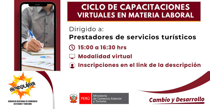 Capacitaciones virtual en "Materia Laboral" de Gercetur Arequipa, dirigido a fortalecer la gestión empresarial en el sector turismo.