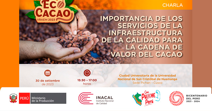 El Inacal, organismo adscrito al Ministerio de la Producción del Perú, y ente rector del Sistema Nacional para la Calidad en el país, formará parte del ciclo de conferencias del “II Encuentro Internacional del Cacao Orgánico y Chocolate de Aroma VRAEM 2023” – #ECOCACAO2023, difundirá a través de una charla presencial, los beneficios de utilizar los servicios de la Infraestructura de la Calidad (Normalización, Acreditación y Metrología) en la cadena de valor del cacao.