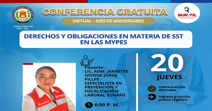 Conferencia virtual gratuita "Derechos y obligaciones en materia de SST en las MYPES" del Colegio de Contadores Públicos de Junín