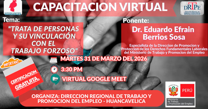 Conferencia virtual gratuito: "Trata de Personas y su vinculación con el Trabajo Forzoso" de la Drtpe Huancavelica
