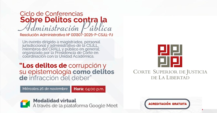 Público Objetivo: Dirigido a magistrados, personal jurisdiccional y administrativo de la CSJLL. miembros del CRALL y público en general organizado por la Presidencia de Corte en coordinación con la Unidad Académica.