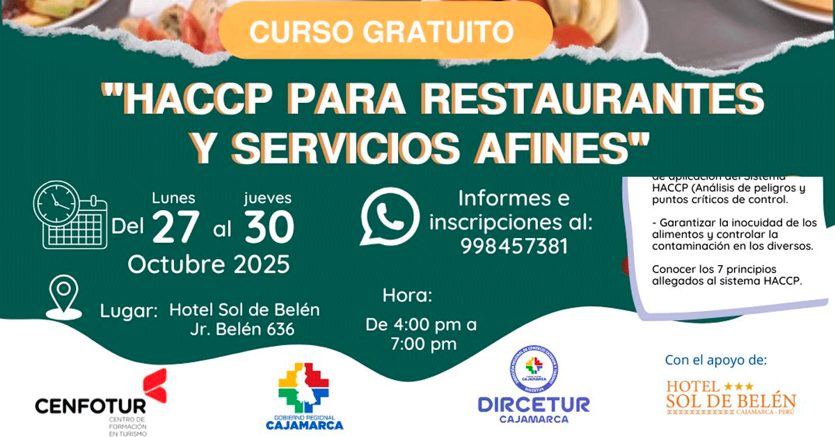 Dirigido a: Administradores y personal de establecimientos del sector turístico, restaurantes, cafeterías y hoteles de la Provincia de Cajamarca
