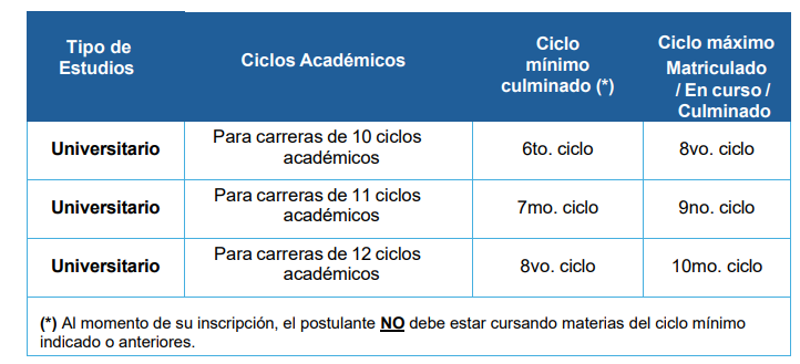(*) Al momento de su inscripción, el postulante NO debe estar cursando materias de ciclos anteriores o del ciclo mínimo indicado