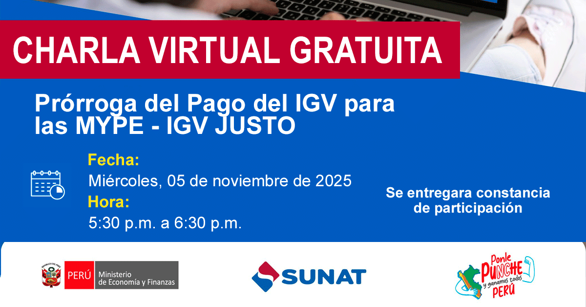 Charla virtual gratuita "Prórroga del Pago del IGV para las MYPE - IGV JUSTO" de la SUNAT