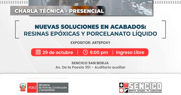 Evento presencial gratuito "Nuevas soluciones en acabados: Resinas epóxicas y porcelanato líquido" del SENCICO
