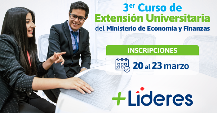 El Ministerio de Economía y Finanzas te invita a participar en la 2da edición de su Curso de Extensión Universitaria 2025 +Líderes, en el cual se brindarán conocimientos teóricos y prácticos en materias vinculadas a la gestión de los sistemas administrativos con rectoría del MEF, diseño y formulación de políticas públicas, macroeconomía avanzada, microeconometría, macroeconometría, entre otros.
