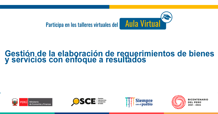 Inscripción: Del 1 al 5 de setiembre de 2023 (a partir de las 05:00 p.m.) Dirigido a: Servidores con certificación por niveles OSCE en el nivel básico Duración: Del 7 al 23 de setiembre de 2023 Horas: 24 horas Vacantes: Limitadas