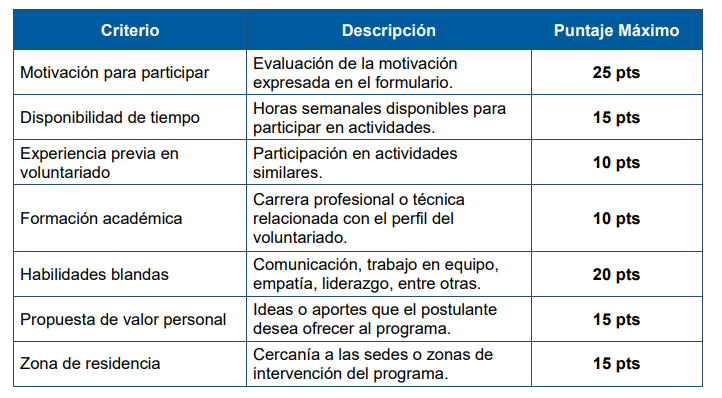 Los postulantes deberán completar un formulario de inscripción en línea, el cual será evaluado automáticamente en base a los siguientes criterios: